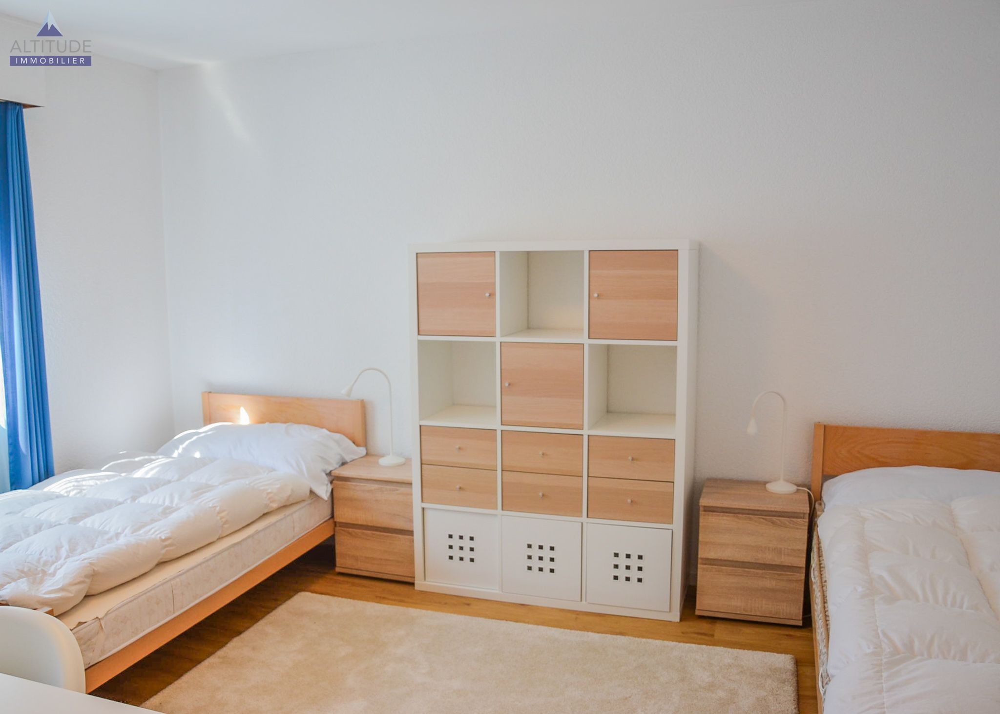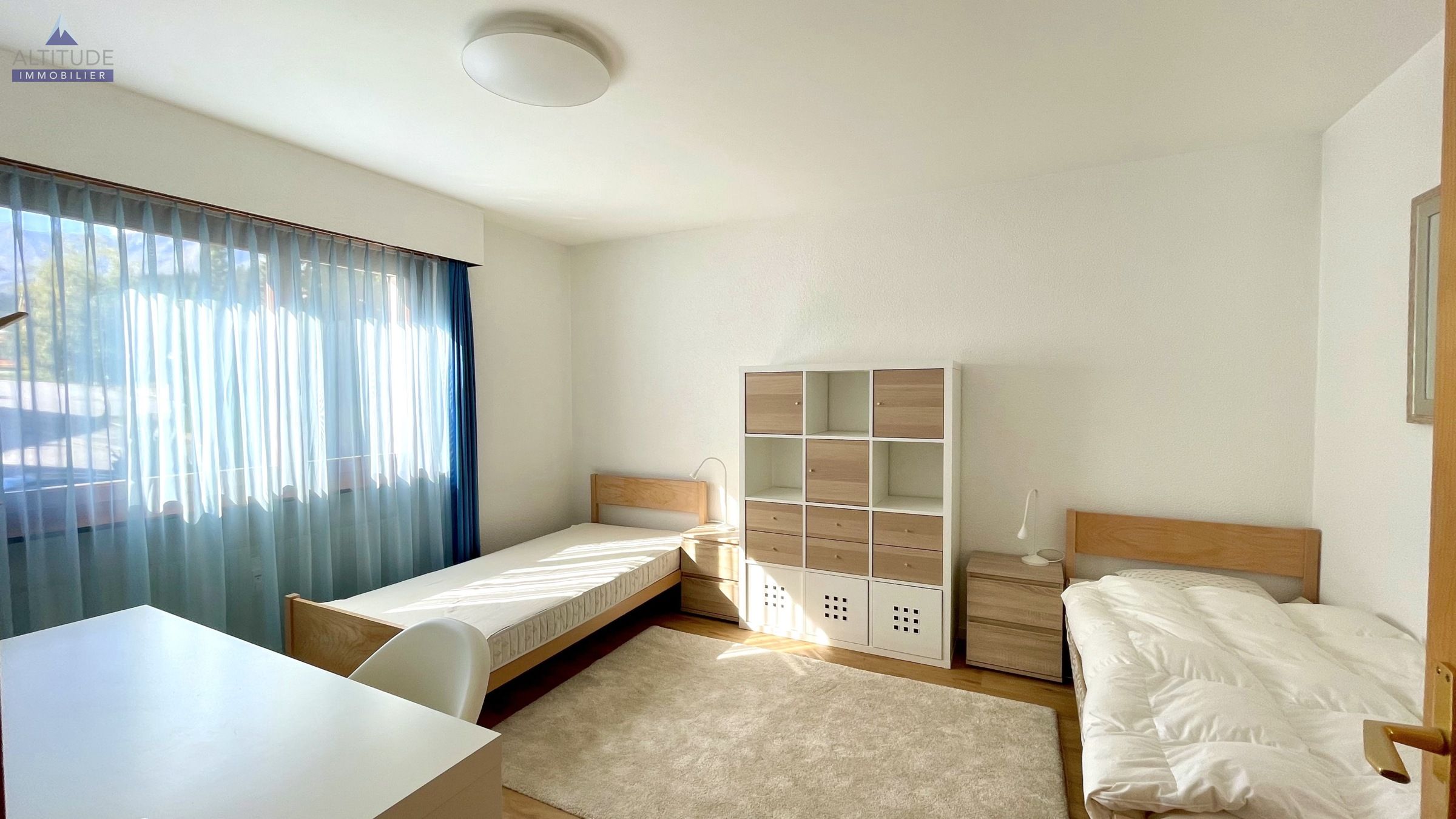 - Une chambre avec 2 lits single, armoires murales, petit bureau et étagères