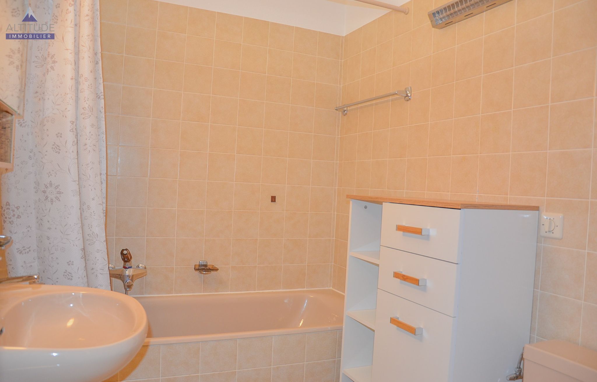- Une salle de bains, avec lavabo, bain et WC, 2 meubles de rangement